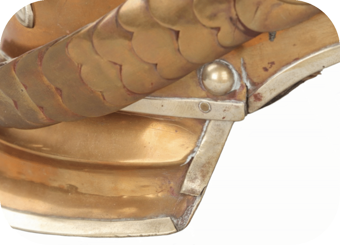 - Neu bei diesem Helmmuster war die beidseitige nur 0,4 cm breite Kanteneinfassung am Helmkopf, die zwischen dem Vorder- und dem Hinterschirm verlief (Bild 2). Damit wollte man ein Einreißen des Helmkopfes verhindern, wie es besonderes häufig bei Tombak-Helmen im Bereich der Stelle geschah, an der die Einfassungsschiene des Vorderschirmes bisher endete (Bild 3). Es gibt eine Menge nachgearbeitete Helme bei denen die Schienen nachträglich angelötet wurden. Diese sind zumeist an einem unsaubereren Stoß zwischen den Einfassungsschienen erkennbar.