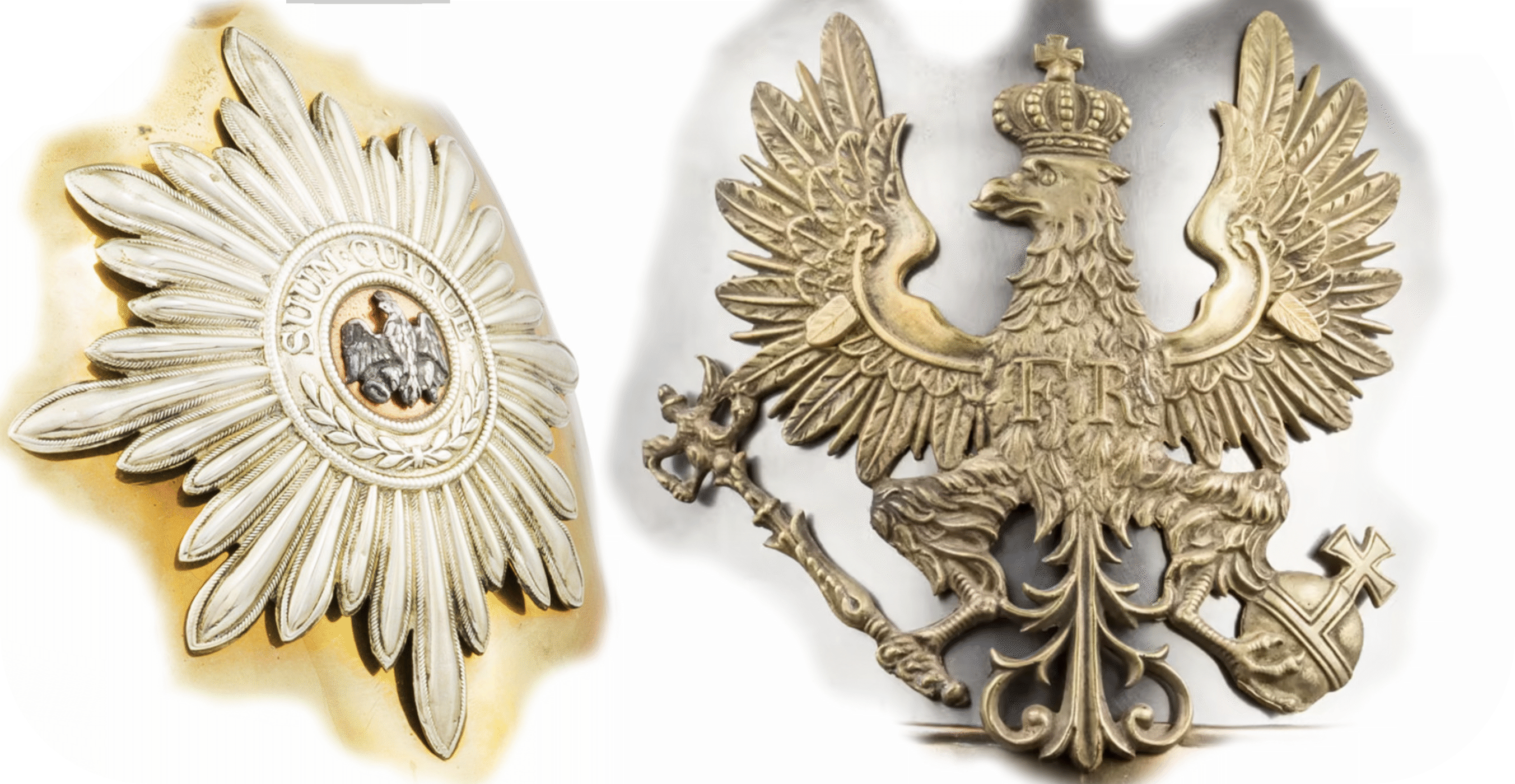 The star of the Order of the Black Eagle was worn as a helmet decoration on the front of the guards (Fig. 3 left). This was presumably specified with a size of 14.0 cm, as described in the clothing regulations of 1895, but it was measured somewhere between 13.0 - 14.0 cm. It was made of the same material as the visor trim. For the line cuirassiers, the helmet ornament consisted of an approximately 12.5 - 13.0 cm high eagle plate, as used for the leather helmet (Fig. 3 Right). To attach the decorations to the helmet, 2 threaded pins were soldered to the back, which were inserted through matching holes on the helmet shell and fixed with squared bow nuts. Sometimes, however, manufacturers deviated from these attachment methods. For example, on the eagle shown in Figure 3, screws for fastening were inserted through the eagle plate from the outside. The heads of the two screws were designed in great detail as feathers to make them look as invisible as possible. This again shows how much importance the people in charge at that time attached to appearance and quality.