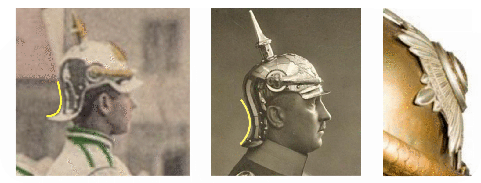 In the 1880s, after the officer's helmet became lower and lower, the rear visor strongly protruded from the back of the wearer's head (Fig. 4 left). In earlier helmet designs, on the other hand, it was tight against the back of the neck (Fig. 4 middle). This was mainly due to the height of the front visor, since the lower edge of the visor was prescribed to be at the level of the eyebrows. Because of the higher visors, the helmet therefore had to be pushed far back in earlier designs, which naturally also pushed the rear visor close to the neck. The lower helmet, on the other hand, could be worn upright, causing the rear visor to stand out so unattractively.