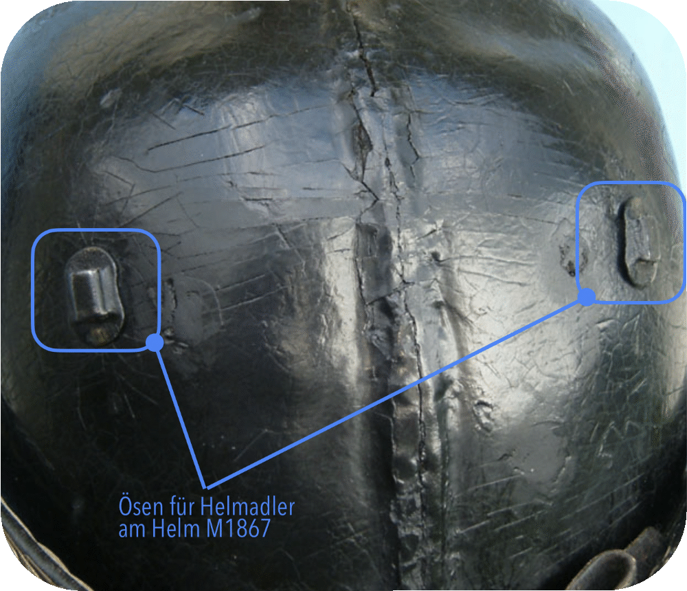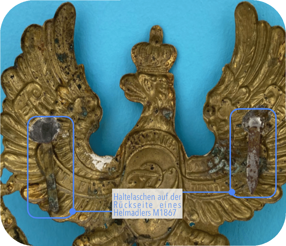 Die Helmadler M1860 und M1867 sind bis auf das Befestigungssystem identisch. Während der Helmadler M1860 jedoch noch mit Gewindestiften und Vierkant-Bügelmuttern (manchmal auch schon mit normalen Vierkantmuttern) am Helm befestigt wurde, wurde für den Helm M1867 ein neues Befestigungskonzept eingeführt. Auf der Rückseite des Helmadlers M1867 wurden dafür zwei längliche, nach unten gebogene Laschen angelötet, die in passende Ösen am Helm geschoben wurden (Bild 9+10). Die Armee versprach sich davon eine schnelle und werkzeugfreie Möglichkeit zum Abnehmen der Helmadler, da diese oft in der Sonne funkelten und den gegnerischen Scharfschützen somit ein gutes Ziel boten. Dieses Befestigungssystem wurde aber schon 1871 wieder abgeschafft, da die Helmadler nun zu häufig verloren gingen.