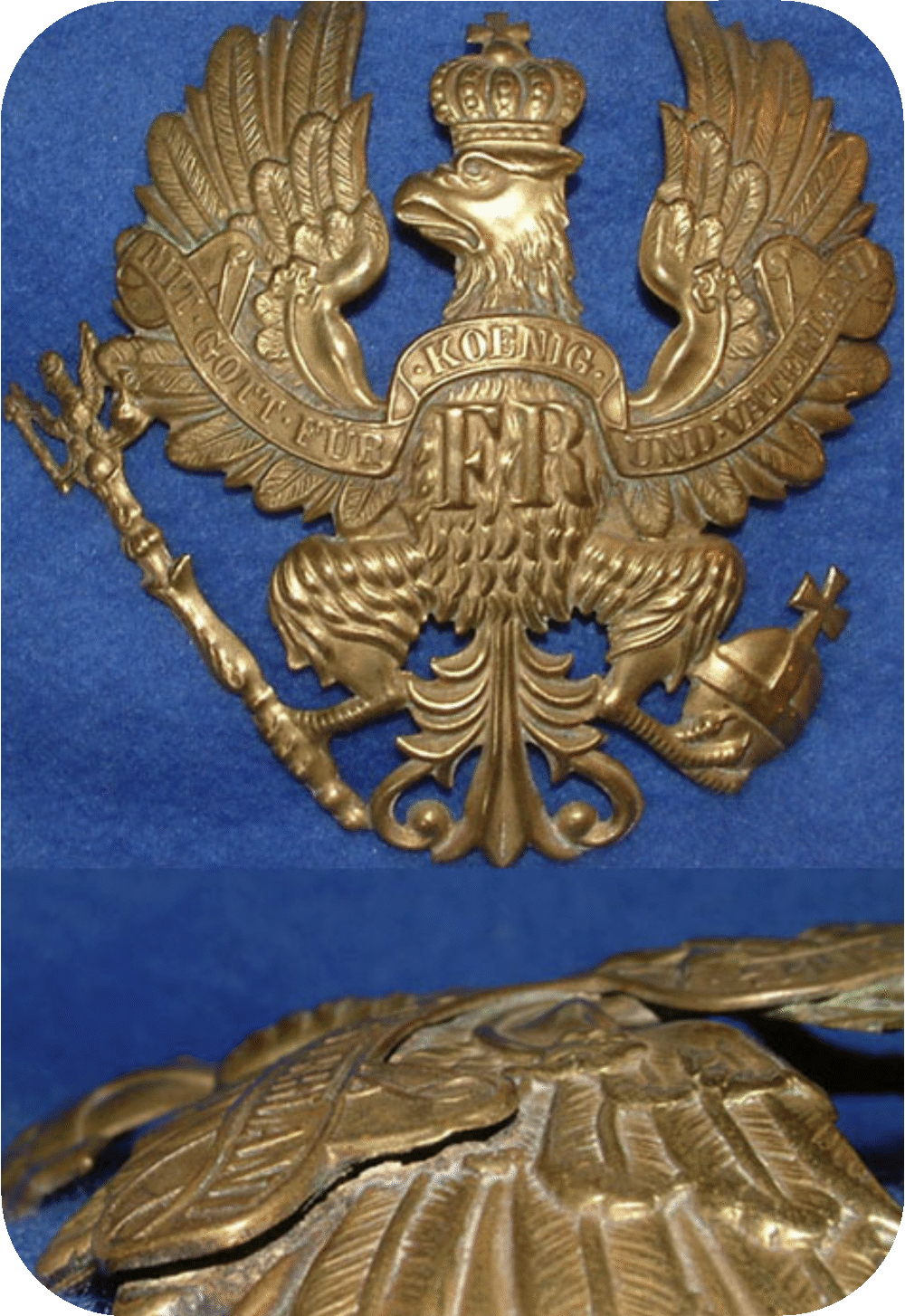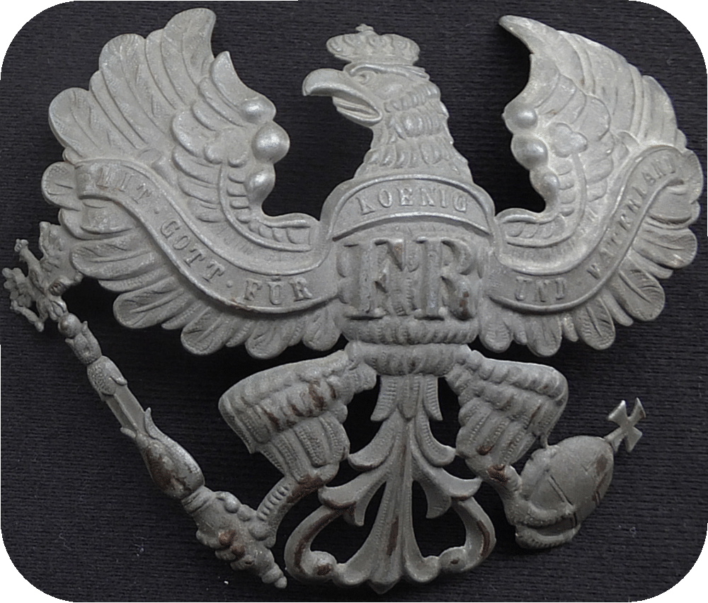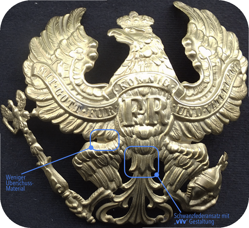Da die Hersteller damals noch nicht in der Lage waren kleine Zwischenräume ohne viel Aufwand freizuschneiden, blieb nach dem Pressen zwischen den Flügeln und Oberschenkeln der Helmadler immer noch einiges an überschüssigem Material stehen. Eine Nacharbeit wäre zweifelsfrei möglich gewesen, doch der Aufwand wäre nicht unerheblich und die Kosten damit zu hoch. Da es zudem nicht groß auffiel verzichteten die sparsamen Preussen auf diesen Arbeitsschritt und ließen das Überschuss-Material stehen. Der auf Bild 2 gezeigte ist der verbreitetste Helmadler für Mannschafts- und Offiziershelme. Es gibt noch weitere Varianten des Helmadlers M1842/43, mit größeren Abweichungen am Schwanzfederansatz, aber dieses waren, soweit ich das in Erfahrung bringen konnte, ausschließlich Landwehradler. Daher vermute ich das es alles nur Helmadler von Eigentumshelmen waren.