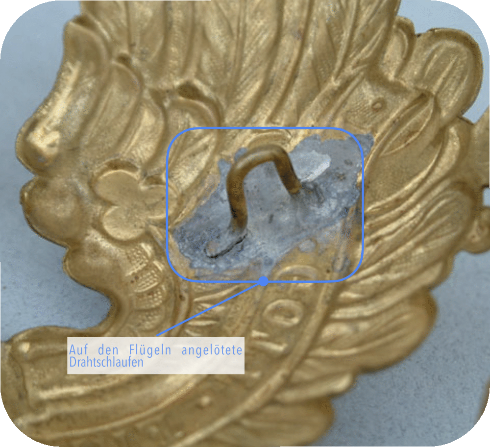 Zur Befestigung am Helm wurden entweder Gewindebolzen mit einem Tarnkappen-Kopf durch 2 dafür eingebrachte Bohrungen in den Flügeln gesteckt (Bild 1+3) und im Helm mit Vierkant-Bügelmuttern verschraubt, oder es wurden rückseitig 2 Gewindestifte angelötet und ebenfalls mit Vierkant-Bügelmuttern verschraubt (Bild 4). Die Tarnkappen-Köpfe der Durchsteckbolzen wurden oft an das durch die Bohrung im Helmadler fehlende Federbild angepasst, was mal mehr und mal weniger gut gelang (vgl. Bild 1+3). Manche Tarnkappen-Köpfe sind aber echte Kunstwerke, die mir immer wieder zeigen wie stolz die damaligen Handwerker auf Ihre Arbeit waren.