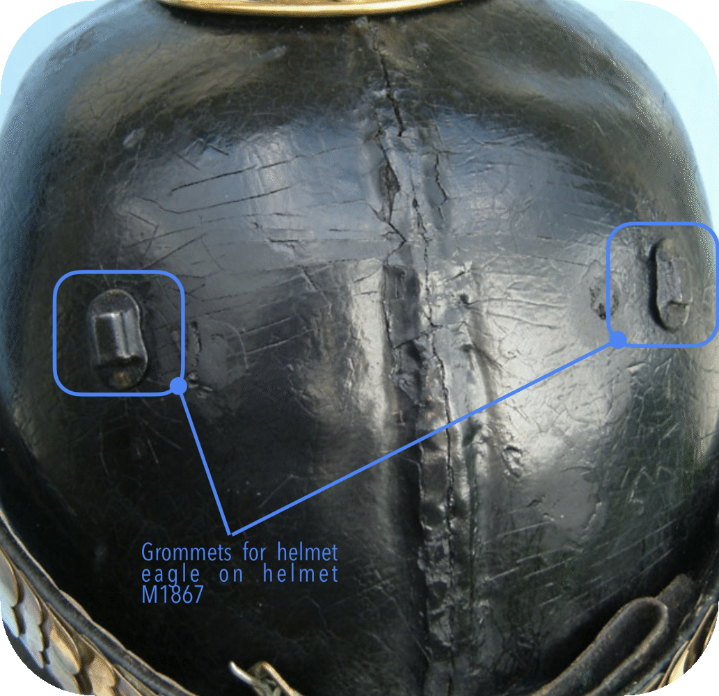 Fig. 10 also nicely shows that the seam of the helmet shell of the pickelhaube M1867, if not made of one piece, moved to the front, where it was mostly covered by the helmet eagle. This step was necessary because the spine on the back of the helmet M1867 was dropped for weight reduction and no ugly seam was wanted to be seen on the now completely visible surface.