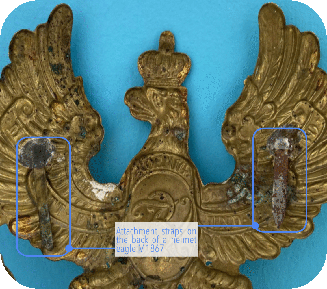 The helmet eagles M1860 and M1867 are identical except for the fastening system. However, while the helmet eagle M1860 was still attached to the helmet using threaded pins and rectangular bow nuts (sometimes also with normal square nuts), a new attachment concept was introduced for the helmet M1867. On the back of the helmet eagle M1867 two elongated, downward bent straps were soldered, which were placed into matching grommets on the helmet ( Fig. 9+10). The army hoped this would allow the helmet eagles to be removed quickly and without tools, since they often shined in the sun and thus offered enemy snipers a good target. However, this fastening system was cancelled again as early as 1871 because the helmet eagles were now lost too often.
