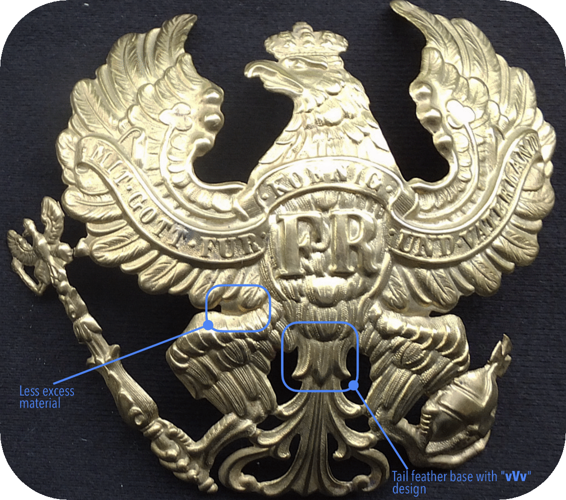 Since the manufacturers of that time were not yet able to cut free small spaces without much effort, there was still some excess material left between the wings and thighs of the helmet eagles after molding. Reworking would have been possible without a doubt, but the effort wouldn't have been insignificant and the costs thus too high. Since it was not very noticeable, the economical Prussians decided to leave the excess material as it was. The one shown in Fig. 2 is the most common helmet eagle for both enlisted men's and officers' helmets. There are other variants of the helmet eagle M1842/43, with larger deviations at the tail feathers, but these were, as far as I could find out, exclusively Landwehr eagles. Therefore, I suspect that they were all helmet eagles of property helmets.
