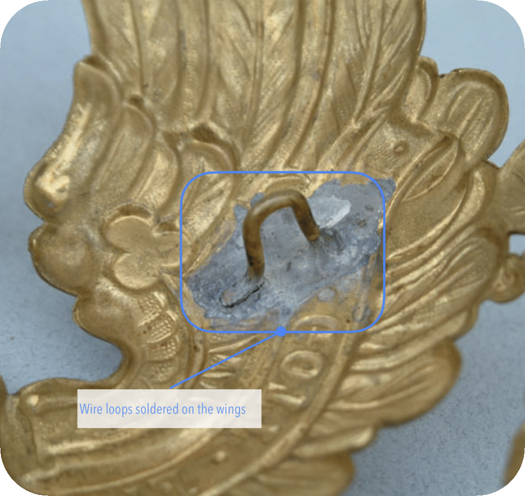 To attach them to the helmet, either threaded bolts with a stealth head were inserted through 2 holes drilled for this purpose in the wings (Figs. 1+3) and screwed to the helmet with rectangular bow nuts, or 2 threaded pins were soldered to the back and also screwed with rectangular bow nuts (Fig. 4). The stealth heads of the pass-through bolts were often shaped to fit the missing feather pattern caused by the hole in the helmet eagle, which was sometimes more and sometimes less successful (cf. Figs. 1+3). However, some stealth heads are real works of art, which always show me how proud the craftsmen of that time were of their work
