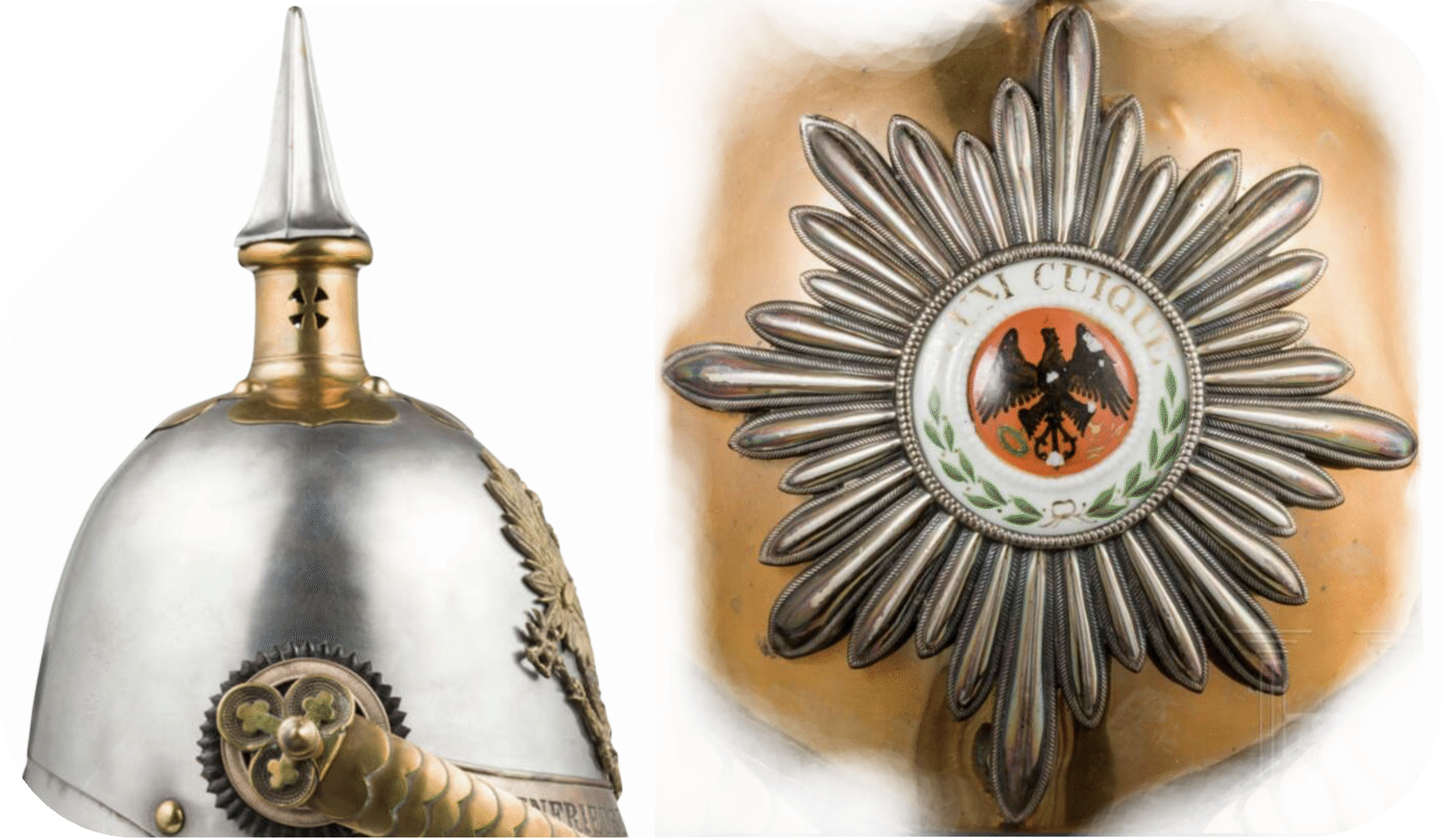 The star of the Order of the Black Eagle was worn as a helmet decoration on the front of the guards (Fig. 3 left). This was presumably specified with a size of 14.0 cm, as described in the clothing regulations of 1895, but it was measured somewhere between 13.0 - 14.0 cm. It was made of the same material as the visor trim. For the line cuirassiers, the helmet ornament consisted of an approximately 12.5 - 13.0 cm high eagle plate, as used for the leather helmet (Fig. 3 Right). To attach the decorations to the helmet, 2 threaded pins were soldered to the back, which were inserted through matching holes on the helmet shell and fixed with squared bow nuts. Sometimes, however, manufacturers deviated from these attachment methods. For example, on the eagle shown in Figure 3, screws for fastening were inserted through the eagle plate from the outside. The heads of the two screws were designed in great detail as feathers to make them look as invisible as possible. This again shows how much importance the people in charge at that time attached to appearance and quality.