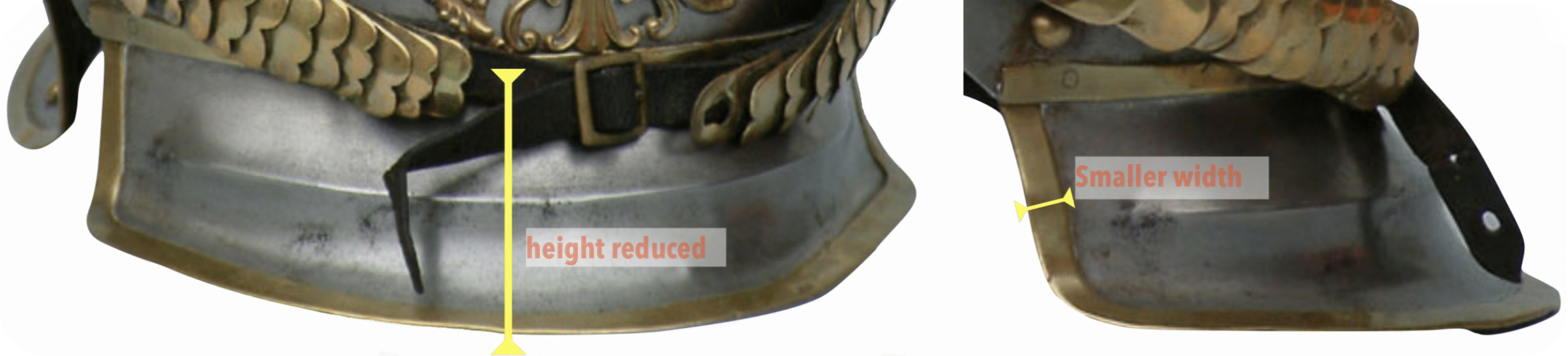 - The metal trim around the front visor was reduced from 0.8 - 0.9 cm wide to around 0.5 cm (Fig. 1).
